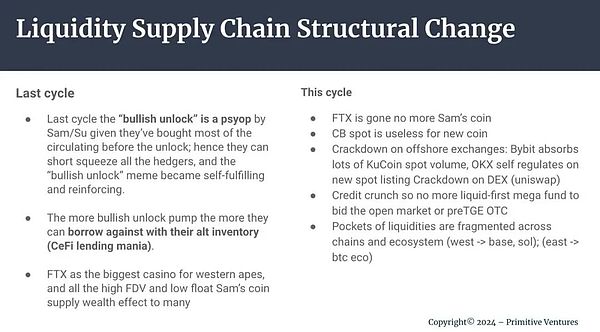 而现在呢?VC token碰到的问题就是这两个community的割裂,主网刚上就TGE,产品根本没有落地,community都是来撸空投的,带来的都是卖盘;而上个Cycle我们还有Sam/Su帮我们上杠杆买入Alt,但这个Cycle杠杆基本被出清;同时,在上个牛市很多VC募到了大量资金,有布局的压力,而为了给LP看到漂亮的账面回报,不得不一轮轮推高项目的估值。
