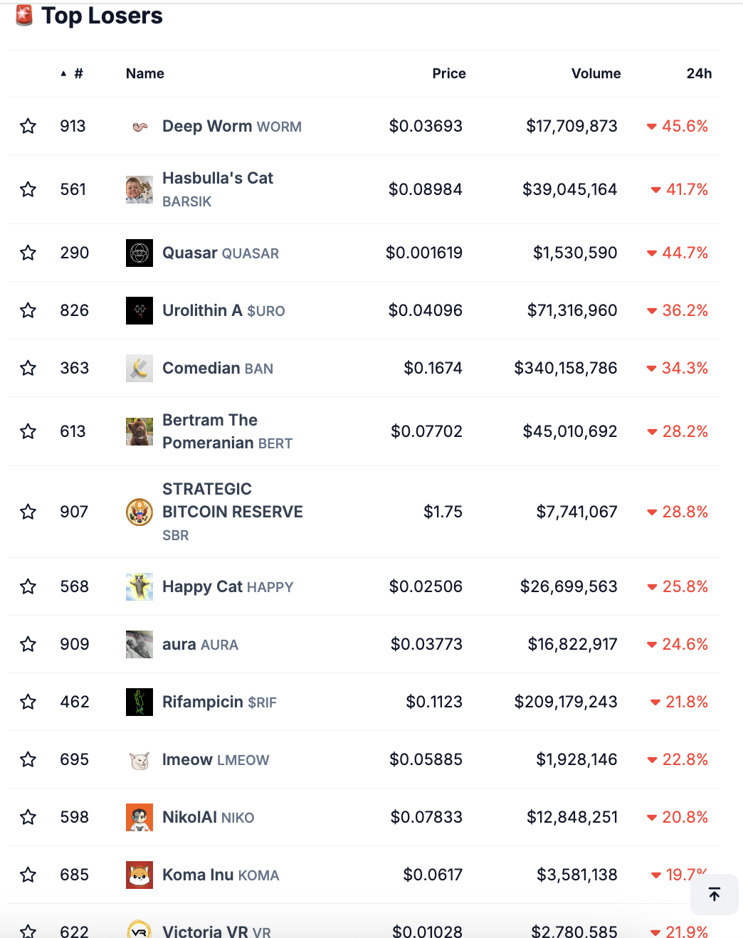 这一感叹并非空穴来风。链上数据如实呈现了惨烈的景象:红色的下跌趋势无情吞噬着社区的希望,哀鸿遍野。以 BIO 生态为例,$URO 跌幅高达 36.2%,$RIF 也不甘示弱,下挫了 21.8%。