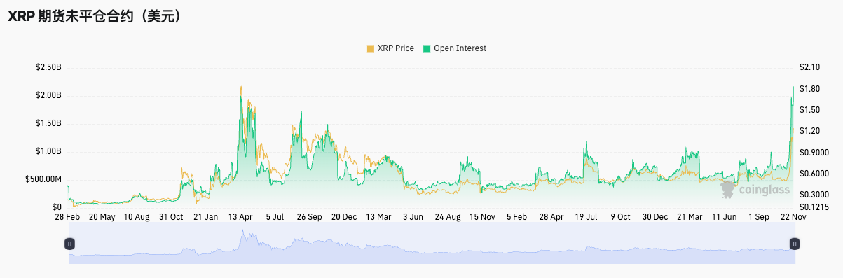从数据上看,据 CoinGlass 数据显示,XRP 期货合约未平仓头寸(OI)已接近 24.4 亿美元,创下历史新高。这一数据反映出市场对 XRP 的投机热情达到了空前的高度。未平仓合约,指的是尚未平仓且未结算的活跃期货或期权合约总量,通常被视为衡量市场活跃度和交易热情的重要指标。