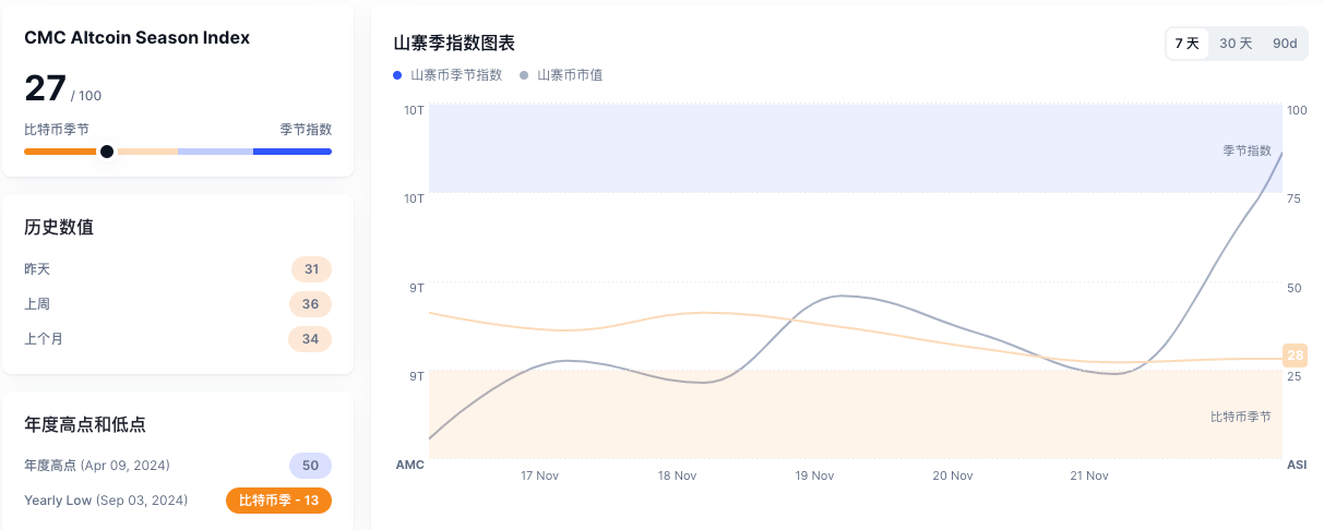 从图表和指数数据来看,CMC 的加密货币山寨季指数目前显示为 27/100,这表明市场仍主要由比特币主导,而山寨币尚未完全进入强势主导地位。但过去 7 天的变化趋势值得关注。山寨币季节指数从 17 日的低点逐步攀升,在 21 日显著跳升至 28,显示出市场对于山寨币的兴趣正在复苏。