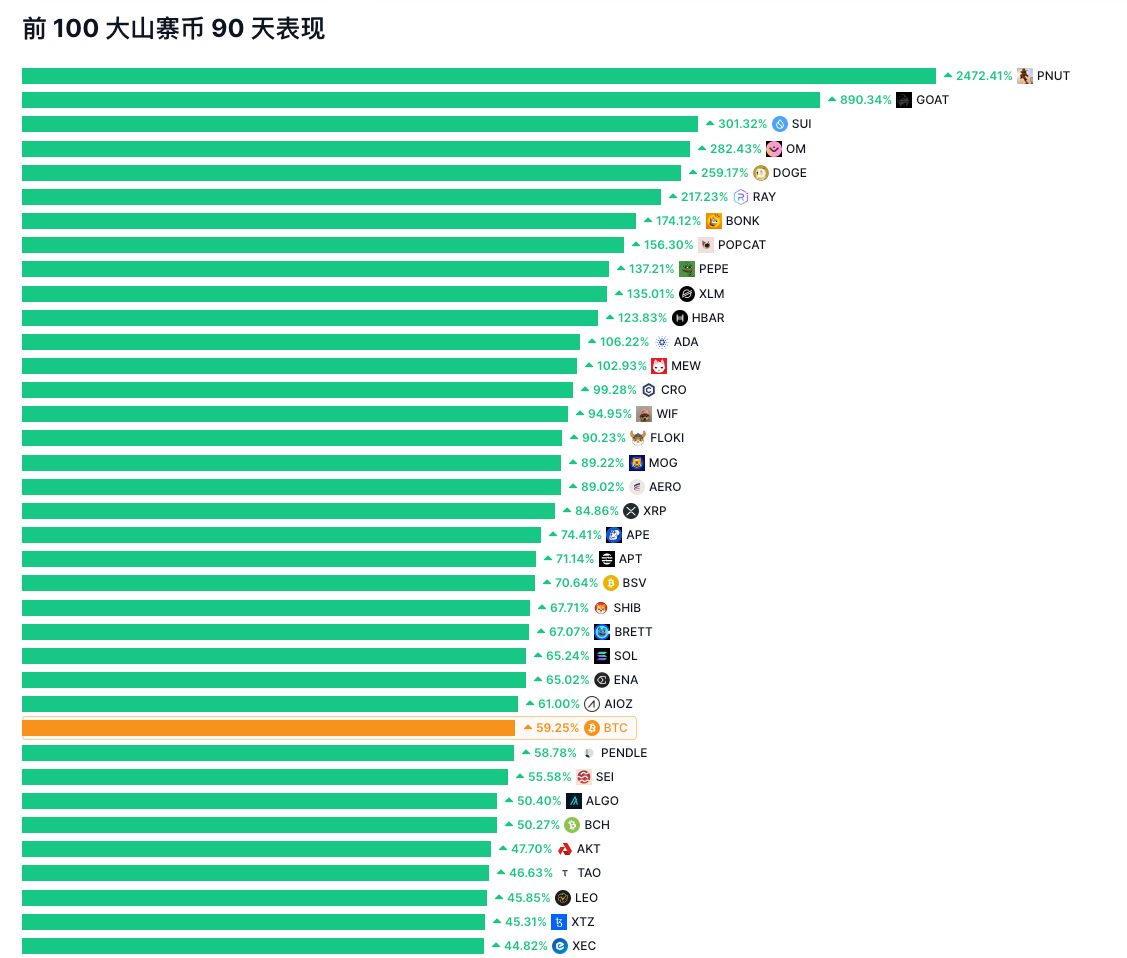 不过从 Top100 过去 90 天表现来看,Meme 币凭借其高投机性和社交驱动力,市场地位短期内仍难被撼动。