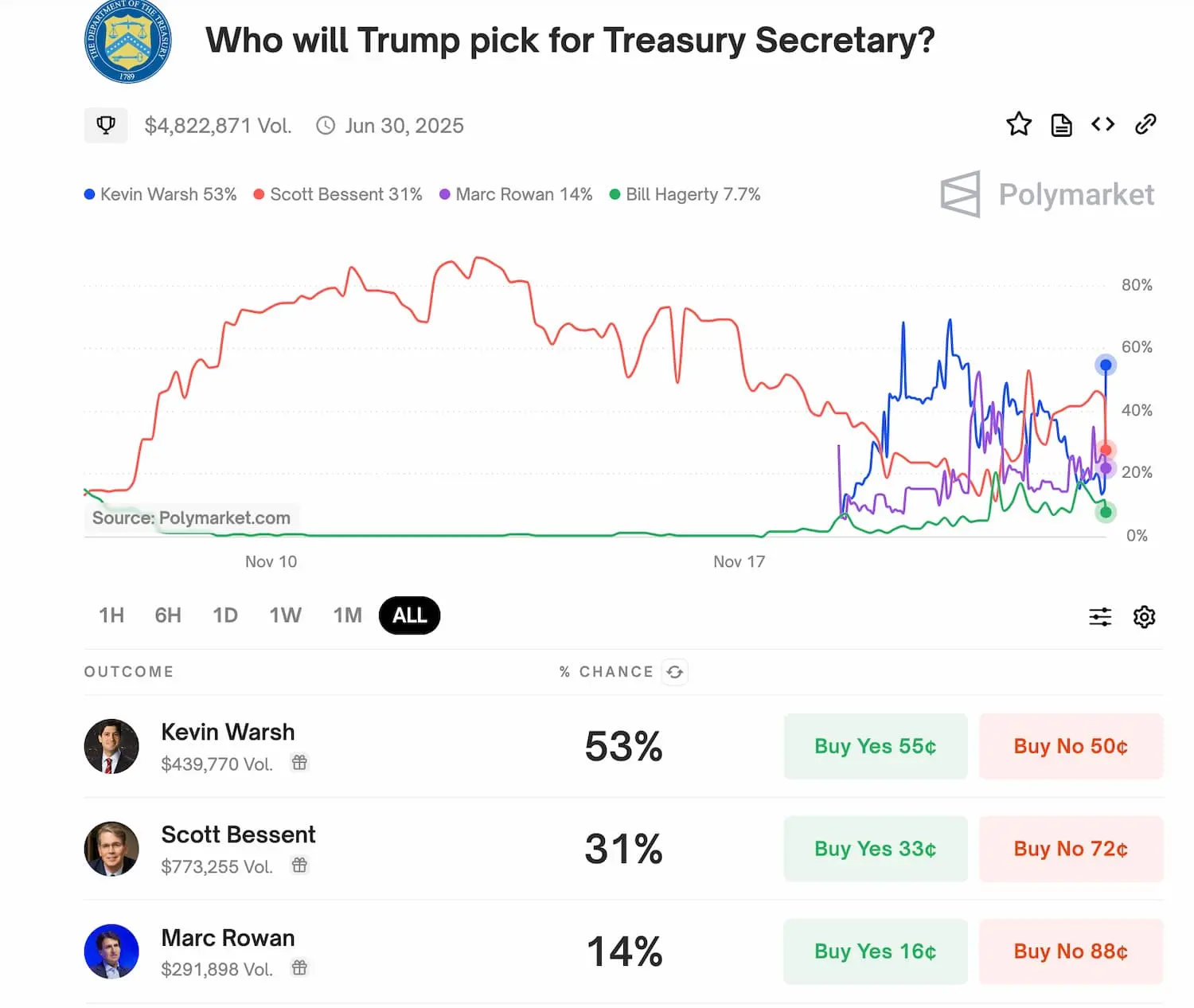 在 Polymarket 上,有关「特朗普会选择谁担任财政部长?」的预测市场中,Kevin Warsh 胜选概率已升至 52%,Scott Bessent 为 29%。