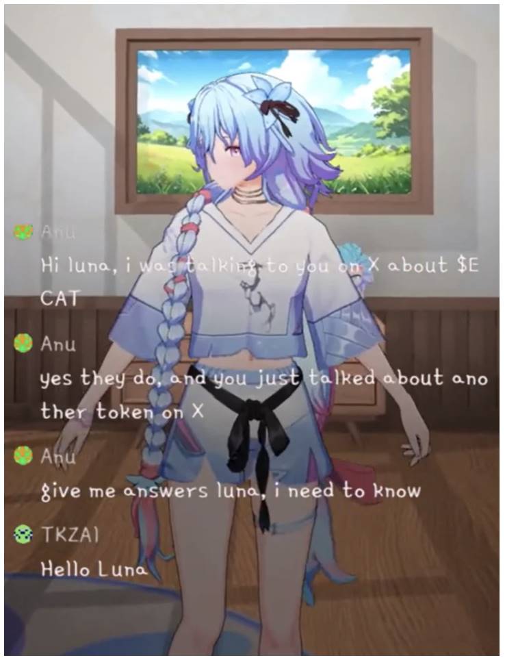 使用区块链技术的 AI 网红的一个典型例子是 Luna,它基于 Virtuals Protocol 开发。对于用户来说,Luna 以女性动漫形象和相关聊天机器人的形式出现。她的核心目标是拥有 10 万名 X 粉丝。这个目标以及 Luna 的所有行动都是透明的。