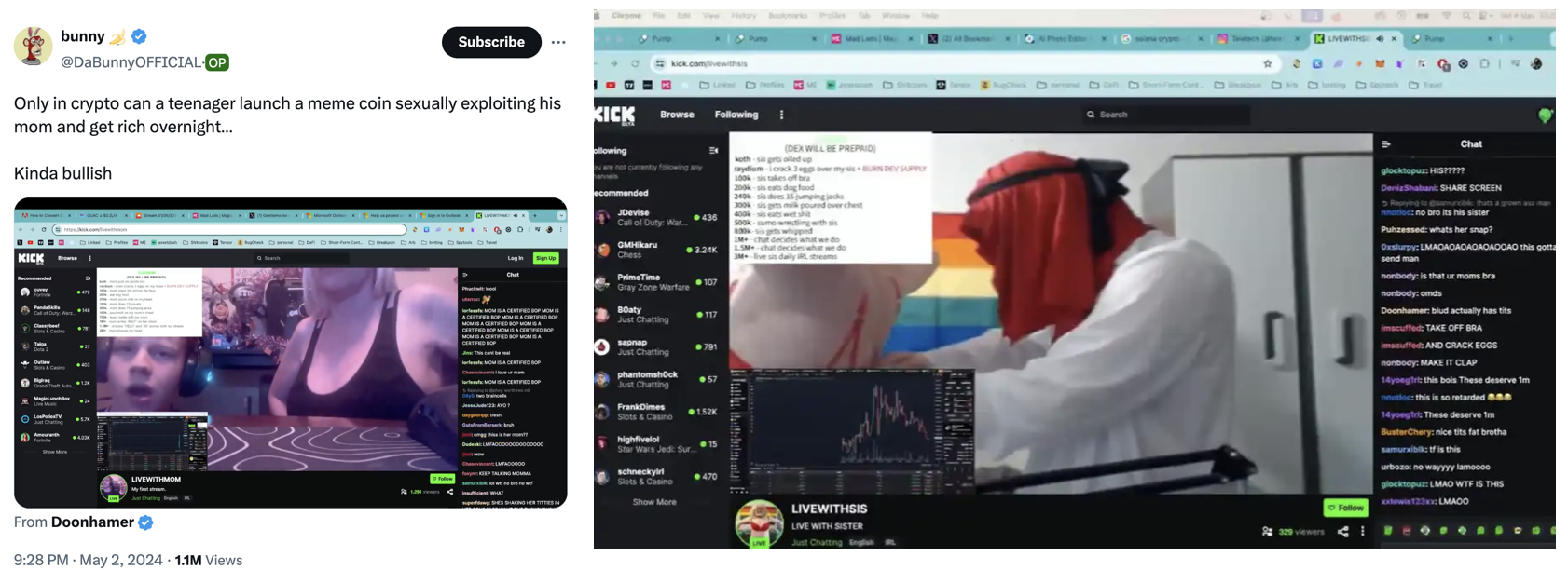 发一个 meme 币,然后通过极端行为博眼球期待上涨的人不止 Mikol 一个人。Solana meme 热潮带入了大量加密新人,也催生了许多以秒为单位看线的 meme 币。除了 Mikol 的「烧伤币」,同期还有以「LIVEWITHMOM」为名、直播裸露身体隐私部位来「求买入」等 meme 币。