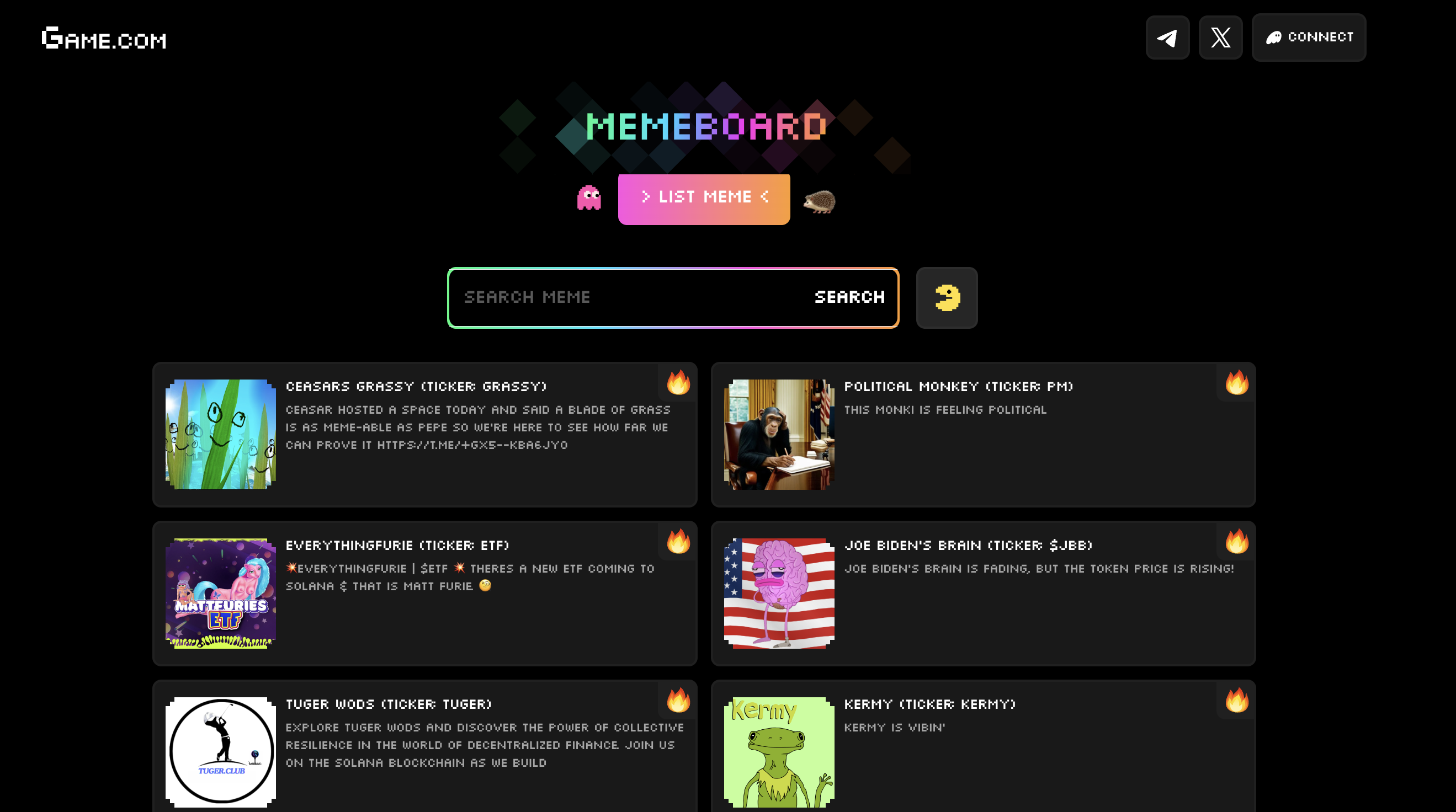 目前,已经出现了一些 meme 展示平台,如推特粉丝量才刚刚突破 7000 个的 Game.com,提供付费 list 代币服务,支付 0.8 个 SOL,就可以将自己发行的 meme 币发布到这个平台上,获得更多关注度。