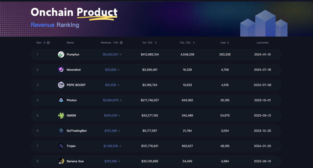 市场早已厌倦了对技术发展的等待,转而关注收入和 PMF,从年初的 Friend.Tech 的超高收入,到没有币 Base 链排序收入放进上市公司 Coinbase 的财报中,再到 Pump.fun 这个资产发行平台仅用 200 多天就完成了 1 亿美元收入,市场发现,产生收入,才是接下来的主叙事。于是,在 meme 生态爆发如井喷的背景下,交易场景逐渐走出了一条新赛道。