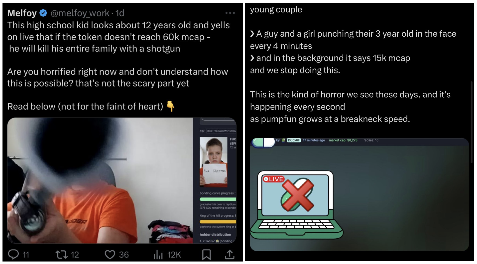 今年 5 月,Pump.fun 首次推出直播功能,但并没有收获预期热度。11 月,官方再次大力推广功能,并成功带动起「直播带 meme」的热潮。然而不到一周,Pump 直播就逐渐开始失控。由于平台内容审核不力,播主为了吸引注意力,不惜做出各式极端行为,甚至对他人产生直接的人身威胁,让这个 Solana 生态的杀手应用陷入法律和监管风险之中。