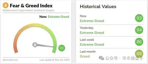 11月13日-11月14日,币安涨幅榜迎来了一批久违的面孔,DOT、FIL、SAND、MANA等上一个牛市的老天王们赫然在列。在坐了长达半年的冷板凳后,老山寨币持有者终于感受到牛市的气息。在老山寨币集体大涨的推动下,本轮牛市的赚钱效应达到阶段性的高潮,市场情绪更是持续处于极度贪婪的状态(93-94)。在过去较长的一段时间里,老山寨币补涨通常被认为是存量仓位和乐观情绪见顶的信号。因此,老山寨币的补涨也引发了市场对调整的担忧。