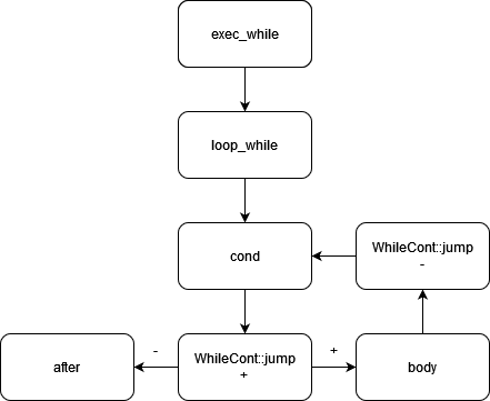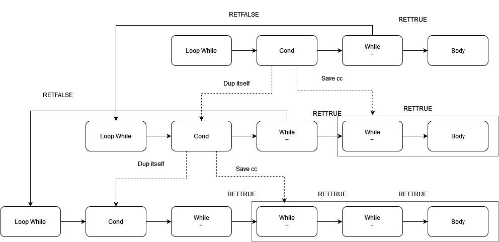 我们看到每次迭代中,主体都扩展了一个WhileCont{chkcond=true}。通过执行上一次迭代中生成并保存的cc,会得到一个类似这样的调用栈: