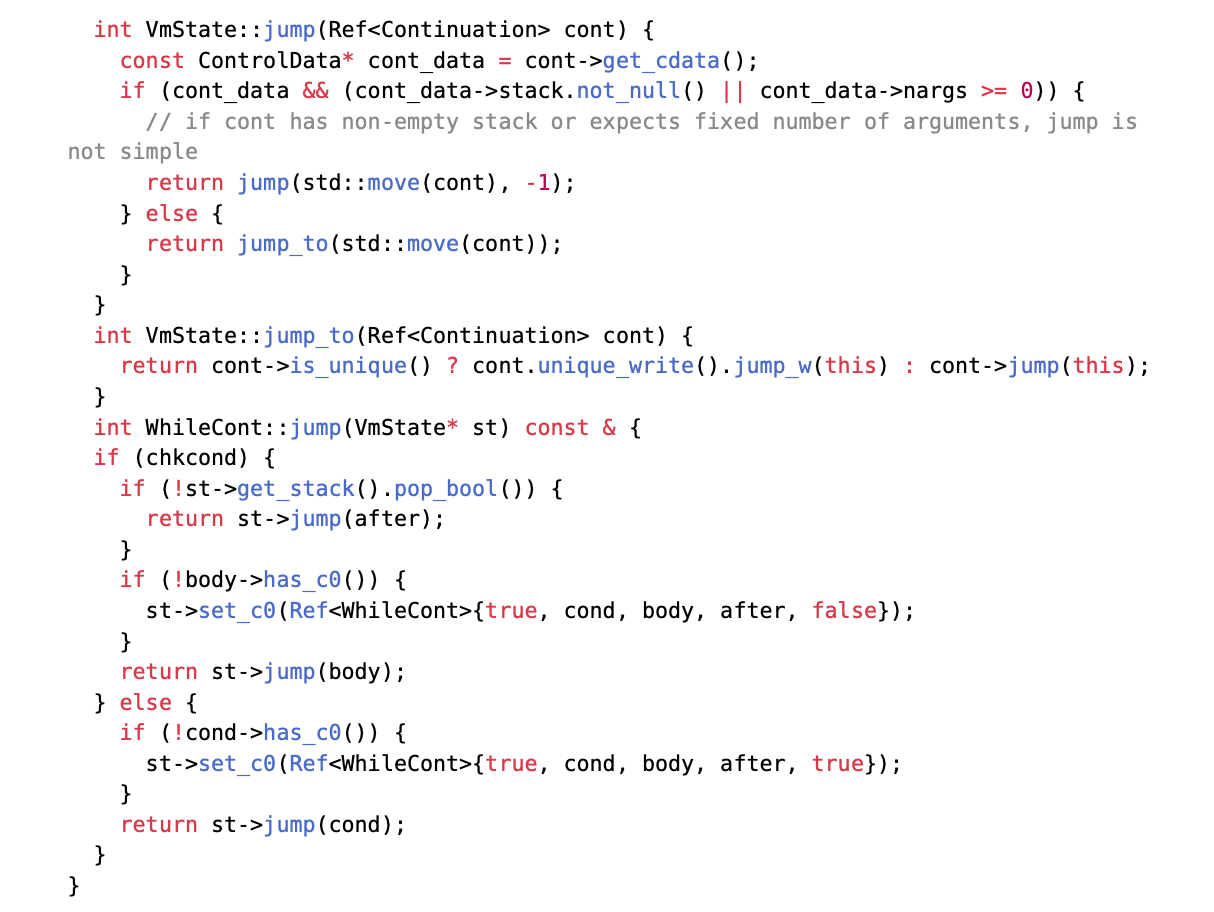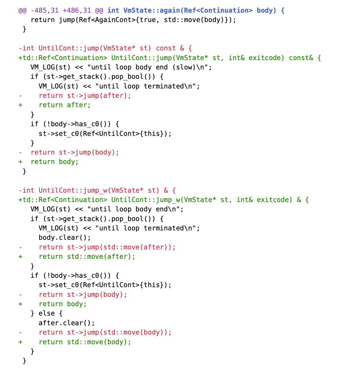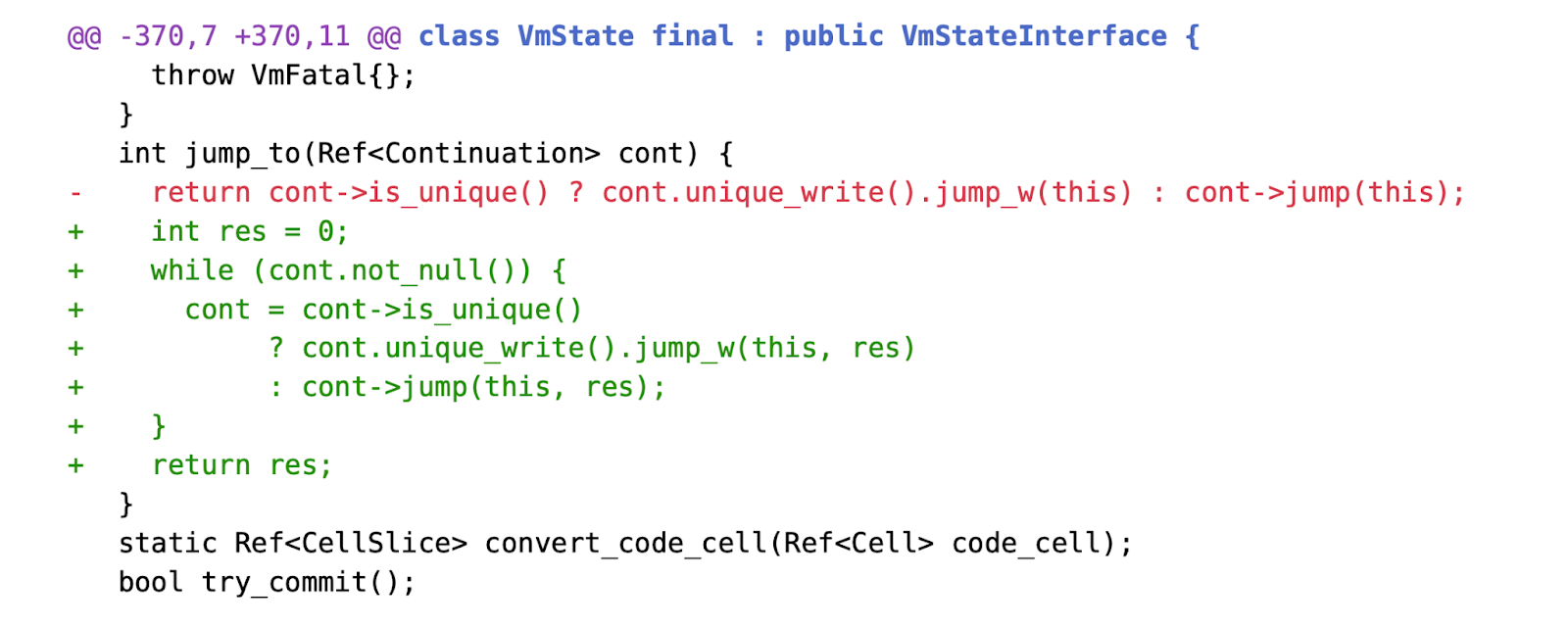 不再调用 VmState::jump来跳转到下一个Continuation,这意味着在每个Continuation上递归执行三重跳转并等待返回值向后传播。现在,Continuation跳转仅解析Continuation的下一级,然后将控制权交还给虚拟机。