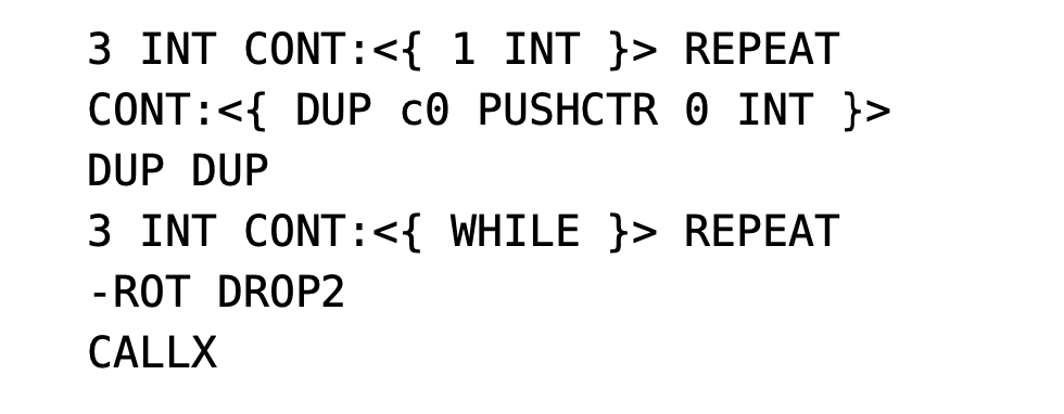 理想情况下,这不会构成问题,因为组件通常表示为OrdCont,其跳转只会保存当前上下文,然后指示虚拟机执行它所持有的片段,先于剩余的合约片段执行,并不会引入更多递归。然而,非普通Continuation在理论上设计允许其组件通过TVM中的cc(c0)寄存器(即上文的set_c0分支)访问。因此,合约可以滥用此功能来执行深度递归(稍后描述)。相比于更改此常规功能的实现,直接在非普通Continuation的跳转过程中消除递归更为清晰且容易。
