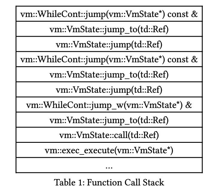 在存在漏洞的虚拟机版本中,这些跳转会导致连续的动态尾调用,这要求主机栈为每次跳转维护一个栈帧(如图2所示)。