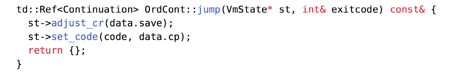 OrdCont(即vmc_std),包含需要执行的TON ASM片段,是TVM中的一级对象。合约可以在运行时显式创建它们并传递,以实现任意的控制流。