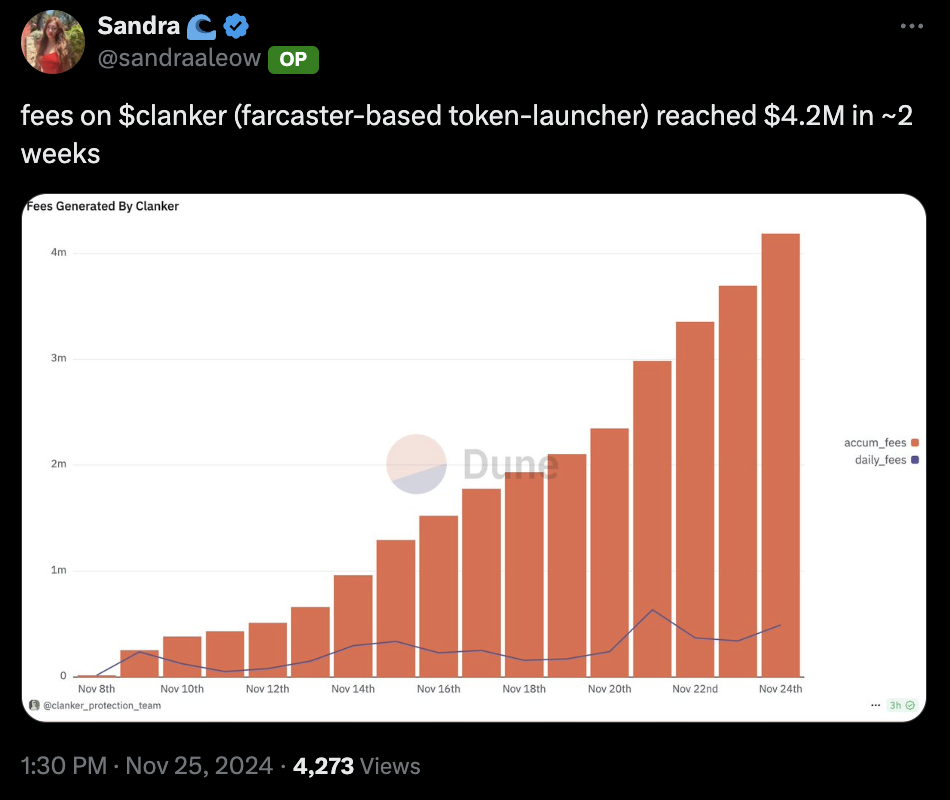 1. 基于 Farcaster 的代币启动器 clanker 的费用在约 2 周内达到 420 万美元。@sandraaleow