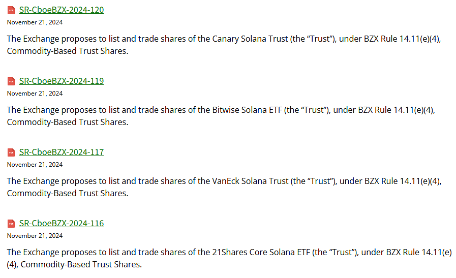11 月 22 日,Cboe BZX 交易所文件显示,该交易所提议在其平台上上市和交易四种 Solana ETF。这些 ETF 分别由 Bitwise、VanEck、21Shares 和 Canary Funds 发起,归类为「基于商品的信托基金份额」,按照规则 14.11(e)(4) 的规定提交。若 SEC 正式受理,最终审批截止日期预计将在 2025 年 8 月初。