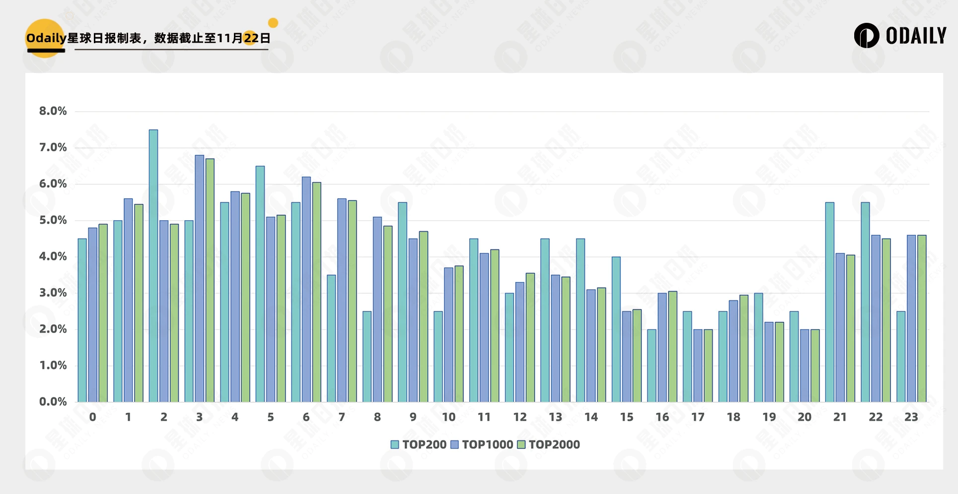 为验证该规律是否正确,我们拓展了研究对象,分别加入市值 TOP 200 和市值 TOP 2000 的代币,为更直观体现,添加柱状图表示如下。可以看到,对于市值 TOP 2000 代币来说, 依旧是 21 点后出现金狗的频率开始大幅提升,也同样是凌晨 3-6 点占据显著优势。