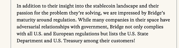 Bridge 的优势在于其合规性和已获得的合作伙伴关系。它遵守所有美国和欧洲金融法规和反洗钱法,并与美国国务院和财政部等信誉良好的合作伙伴合作。