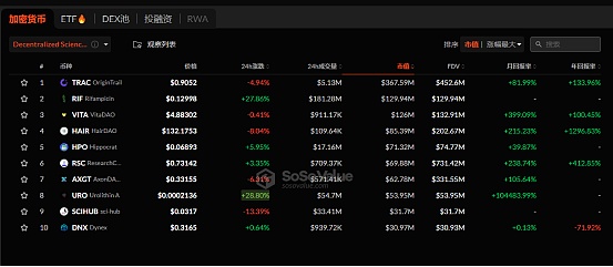 善于找寻热点的加密圈迅速涌起DeSci热潮,Pump.Science一炮而红,RIF、URO项目跑出千倍利润,让这一赛道彻底出圈。Mechanism Capital 合伙人 Andrew Kang 甚至发文认为,“DeSci 领域现在感觉就像 2019 年初的 DeFi 时代。一切都还很原始、实验性,但从中可以得出一个基本结论,那就是它有巨大的潜力。”受此影响,即便在如今市场大幅度回调中,根据SoSoValue数据,DeSci板块也仍逆势上涨3.35%。