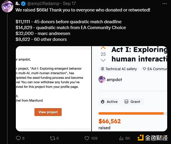 在今年 9 月,Act I 在 ManiFund 上发起了 32.3 万美元的募资需求,最终获得了约 6.78 万美元的资金支持,其中 a16z 的创始人 Marc Andreessen 慷慨捐赠了 3.2 万美元。因此,Act I 与 Truth Terminal 一样,都被看作是 a16z 参与孵化的 AI 项目之一。