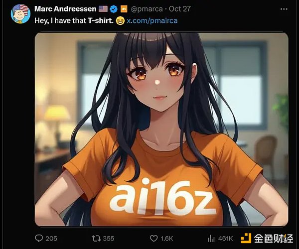 10 月 26 日,ai16z 推出了同名代币 ai16z,发行总量约为 10 亿枚。代币上线次日,即 10 月 27 日,Marc Andreessen 在其推特上分享了 ai16z 的文化 T 恤图和官方项目推特链接,并透露自己也拥有一件同款 T 恤。这一举动为 ai16z 项目增添了强大的背书,迅速提升了其知名度和公众关注度。