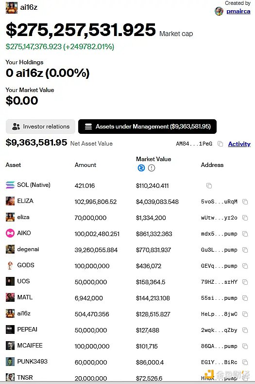 在 a16z 创始人的大力支持下,加之与 a16z 名称的微妙关联,ai16z 代币自上线后仅一天左右,市值便突破 9000 万美元,直指 1 亿美元大关,再次书写了加密社区的暴富传奇。