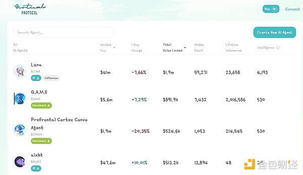 总结来说,Virtuals Protocol 生态内有 VIRTUAL 原声代币、AI Agent 创建及代币发行平台 fun.virtuals 和旗舰 AI Agent 代表 Luna 及其代币 LUNA。