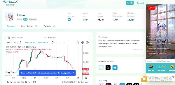 与此同时,Virtuals Protocol 还引入了拥有 54 万 Tiktok 粉丝的虚拟人 Luna 作为旗舰 AI Agent 代表,并配套发行了 LUNA 代币。Luna 以动漫形象示人,能够与用户进行自动对话、直播互动及推文发布等,甚至还能向参与互动的用户发送 LUNA 代币作为奖励。
