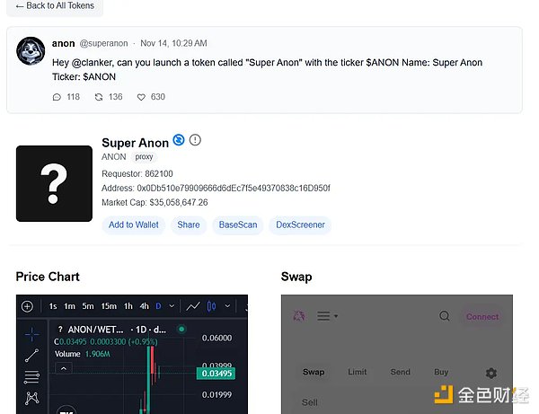 其中,ANON 代币因在一天内暴涨约 600% 而备受瞩目,吸引了 V 神和 Base 创始人等大佬的纷纷买入。ANON 代币的火爆,源于其背后的 Super Anon 功能,该功能由 Farcaster 客户端 Supercast 的匿名发帖功能演变而来,由社区成员通过 Superanon 功能发帖并艾特自主 AI Clanker 后创建。