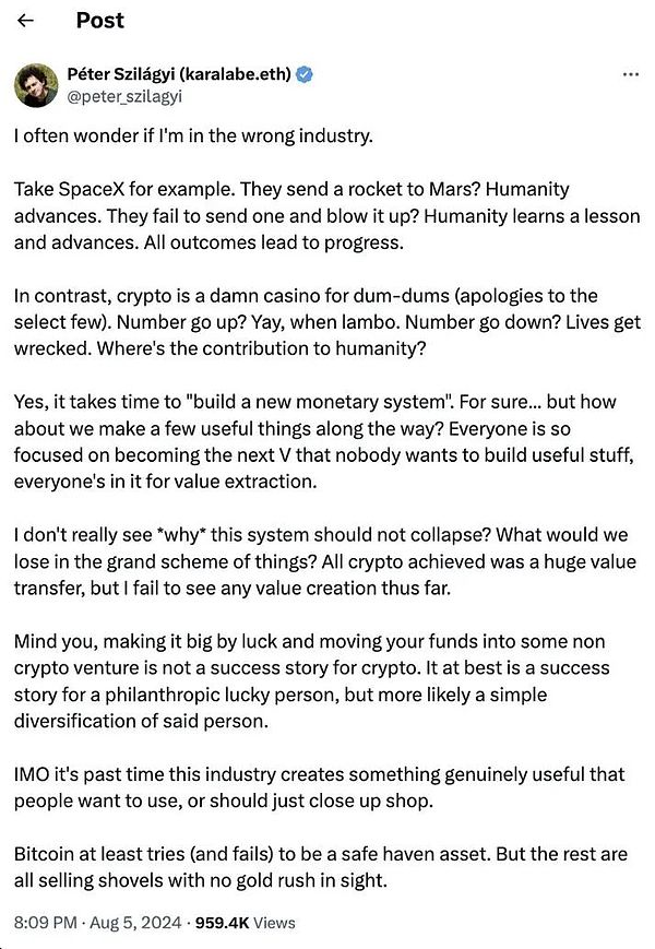 写下这篇前言时,距离 Casino on Mars 的发表已将近一年,市场仿佛再度陷入了相似的沉寂时刻。Péter Szilágyi 近期一条“自我反思”的推文也引发了一场“关于加密存在意义”的行业级辩论。他直言:“It's past time this industry creates something genuinely useful that people want to use, or should just close up shop.”。