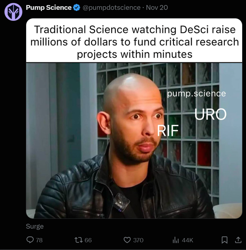 我还没有详细研究过 pump.science,但我并不惊讶它已经成为这个领域最热门的话题之一。的确,围绕它的疯狂投机、合法性和安全性等问题,需要随着时间的推移得到解决(我希望加密领域的人都能承认这一点)。但需要强调的重点是,大家对加密融资应用于非加密使命的概念普遍感到兴奋。