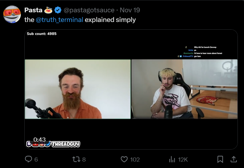 最近 Onchain AI 和 Goat 的热点话题其中一个最酷的地方就是,它吸引了一些 AI/LLM 开发者进入加密领域。我敢打赌,没有人能预测到这场与 Andy Ayery 的 Threadguy 采访