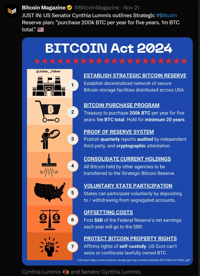 最后值得一提的是,仅仅是关于美国战略比特币储备的讨论就已经令人难以置信!三个月前,如果有人提到这件事,我会说这简直是做梦。然而,随着过去几周内加密货币的势头显著变化——价格上涨、BlackRock ETF 资金大量流入等等——这一切让我们不得不认真考虑一个事实:联邦政府可能真的会将比特币纳入资产负债表。