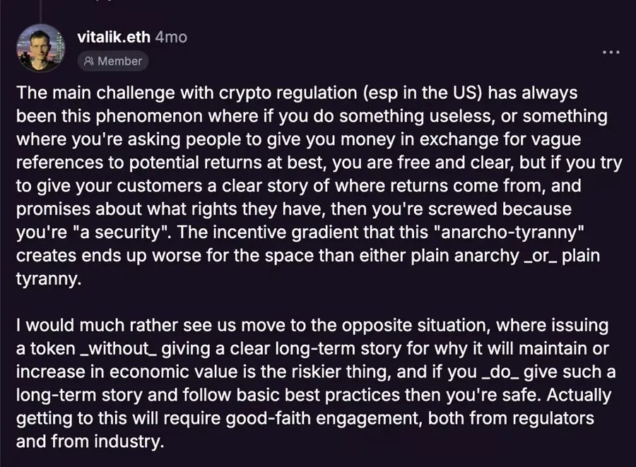 Vitalik 的总结非常到位,如截图中提到的——缺乏明确的监管框架让许多严肃项目的开发者望而却步,抑制了这项技术的成长。