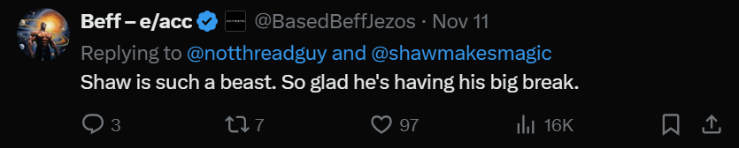 看到 Beff Jezos 为他的朋友 Shaw 加油也很酷,Shaw 正在构建 ai16z 和 Eliza 框架,这是一个用于代理币的启动平台。这里不光是 Beff 的参与,而是有一些深耕 AI 领域的人,通过 LLM 开发者在 Onchain AI 上的实验,开始关注到加密领域发生的事情。这是一个很棒的现象,意味着 AI 与加密的交集正在加深。