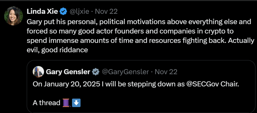 过去四年里,根斯勒几乎是美国加密行业的最大阻碍。他不仅仅拖慢了监管进程,更积极采取行动打击这个新兴产业。Linda 的推文精确地指出了这一点——像 Coinbase、Consensys 等公司,以及无数其他企业,被迫在华盛顿游说和抗争上花费了数亿美元。