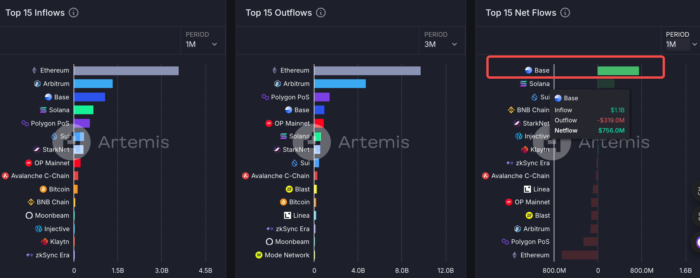 数据不会说谎。据 Artemis 数据显示,最近1个月链上资金流入最多的生态就是 Base,其资金净流入(流入减流出)达到了7.5亿美金;作为对比,Solana 的资金净流入仅有3亿美金左右,不到 Base 的一半。