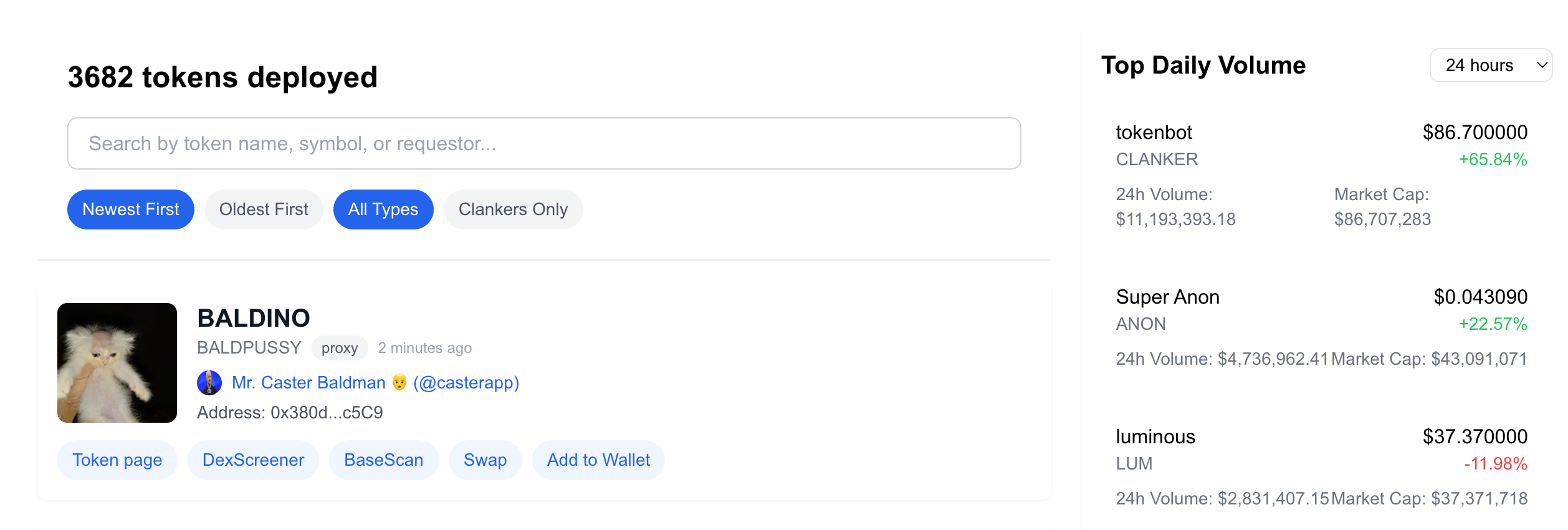 围绕 Clanker:Warpcaster 上的 AI 驱动“Token Bot”,专为快速 DIY 代币部署而设计。你只需在 Farcaster 客户端如 Warpcast 或 Supercast 上标记 Clanker,告诉它你的代币想法,它便会在 Base 上为你启动代币。
