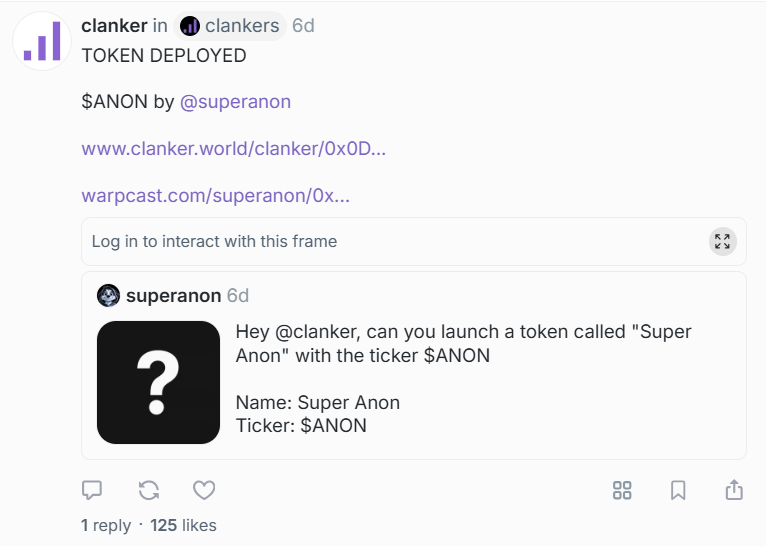 Superanon 自上线后一直顺利运行,到了 11 月 14 日,某匿名用户通过 Superanon 账号与 Farcaster 生态中的 AI Agent 账号 @clanker 互动,成功发出了一个 $ANON 的 MEME 币。