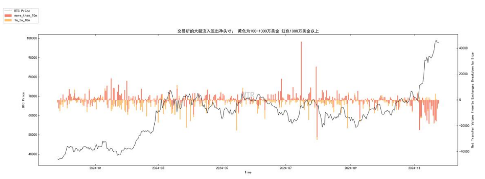 交易所的⼤额转账来看,⼤笔的流出开始初步下降。也就是特别⼤的意愿购买,开始有⼀些放缓的痕迹。