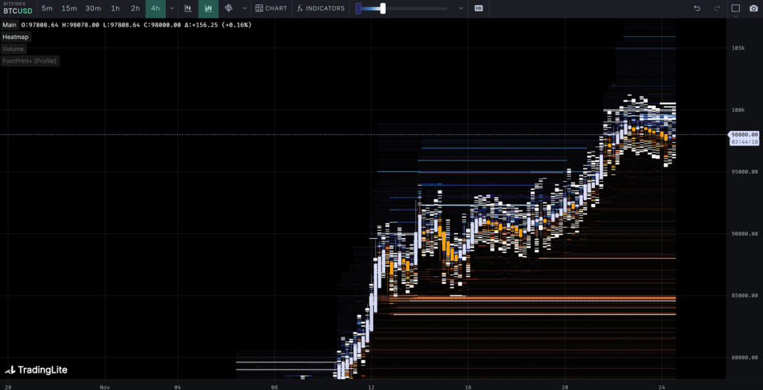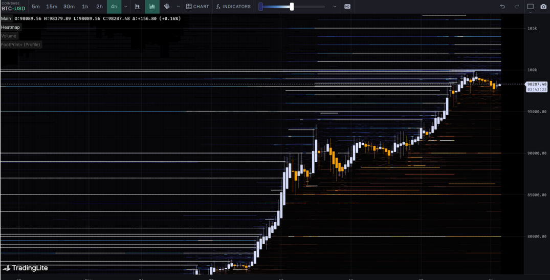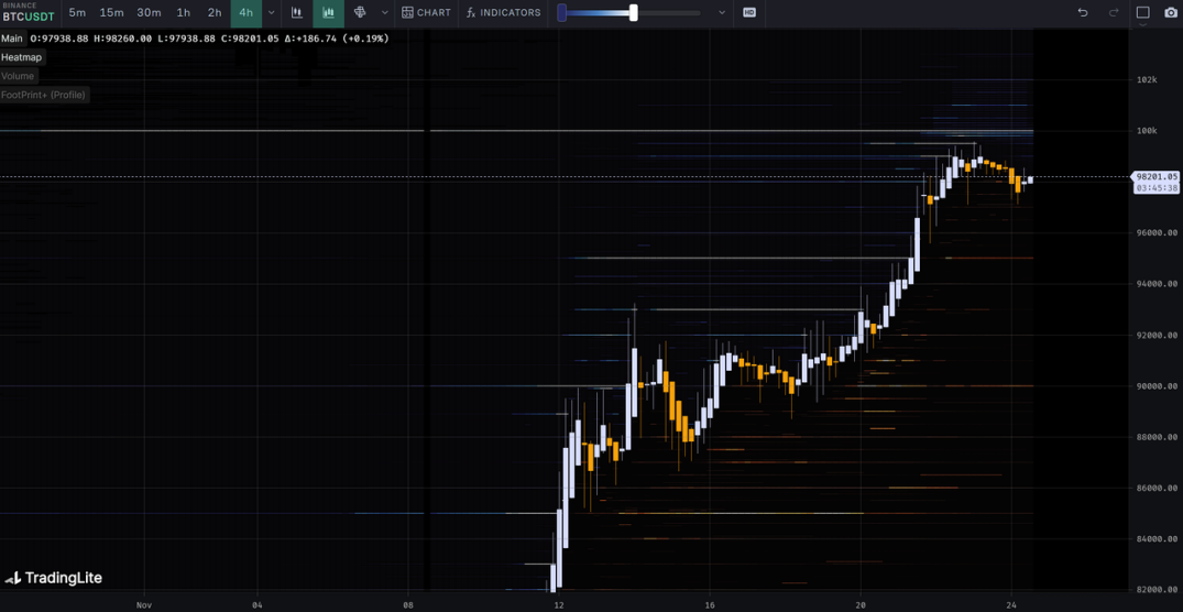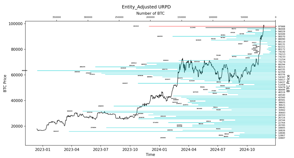 4. 当前价位的上⾏压⼒在 95000-98000 以上,场内博弈较为剧烈;
