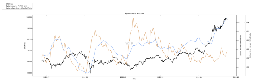 看跌期权⽐例处于⾼位,交易量处于低位。