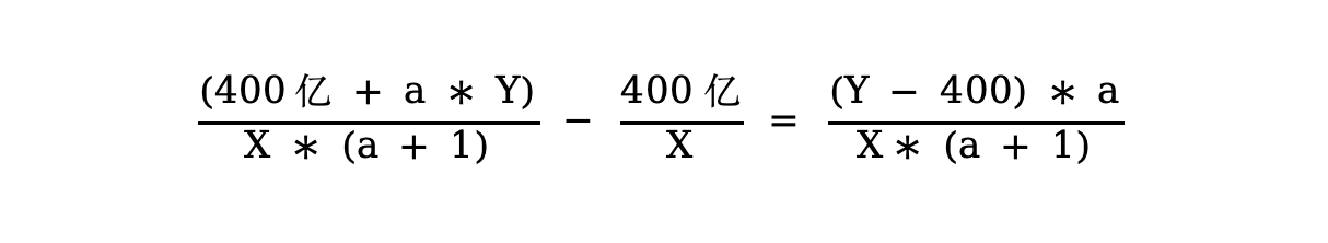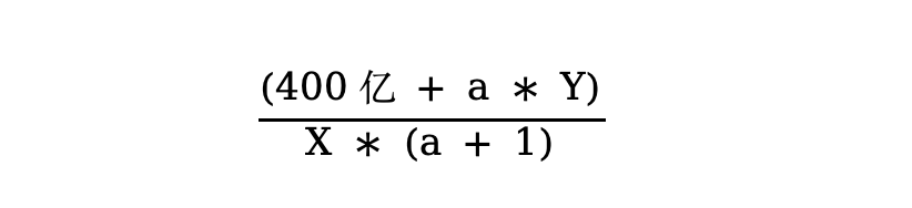 举例来说明,假设当前MSTR持有的BTC为400亿美元,总流通股X,其总市值为Y。则此时每股权益为400亿/ X。以最不利的股权稀释来融资的话,假设增发新股比例为a,这意味着总流通股变为X*(a+1),以当前估值完成融资,共计筹得a * Y亿美元。而将这些资金全部转化为BTC,则从BTC持仓变为400亿 + a * Y亿,意味着每股权益变为: