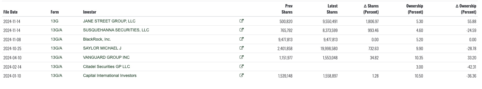 根据当前MicroStrategy的持股比例中,不乏一些顶级的财团,例如Jane Street和贝莱德等,而作为创始人的Michael Saylor仅占10%不到,当然通过双层股权的设计,Michael Saylor拥有的投票权具有绝对优势,因为其持有的股票更多的是B类普通股更多,而B类普通股的投票权于A类是10:1的关系。所以这家公司还处在Michael Saylor强有力的控制下,但是其股权占比并不高。