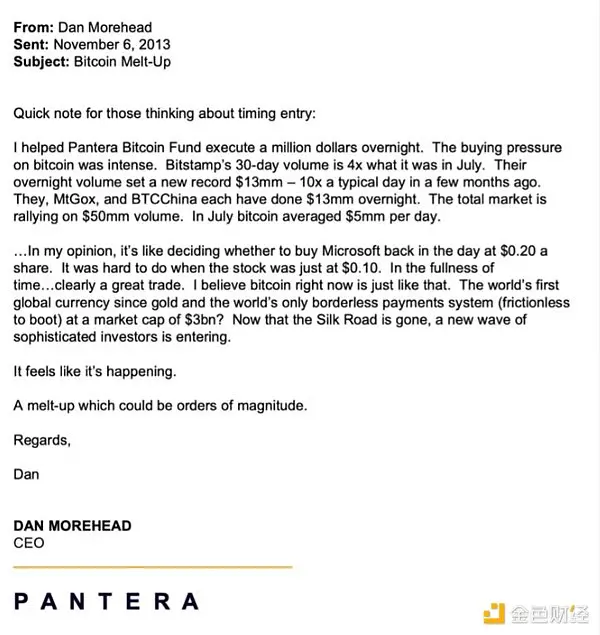 当时比特币的价格约为 130 美元。在接下来的几天里,我眼睁睁地看着比特币价格从 130 美元跌至 100 美元。回想起来很有趣,这基本上和怀疑论者在比特币熊市中所说的「FUD- 恐惧(Fear)、不确定性(Uncertainty)、怀疑(Doubt)」是一样的。即使当比特币价格跌至 65 美元时出现了所有问题,我还是决定 ALL IN——推出 Pantera Bitcoin Fund。三十年的交易直觉让我相信那一天就是开始的日子(that was the day)。