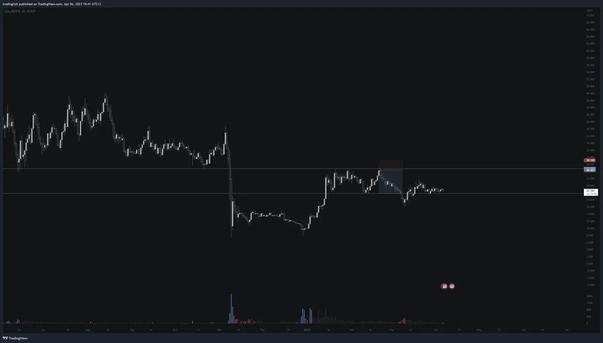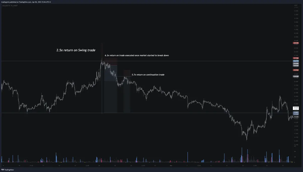 举个例子,2023 年 2 月底,Solana 上涨至日线阻力位后回落,跌至下一个日线支撑位。如果在日线收盘时建立空头头寸,并设置基于 1 日 ATR 的止损,在 18 天内可以实现 2.5 倍的风险回报 (R)。