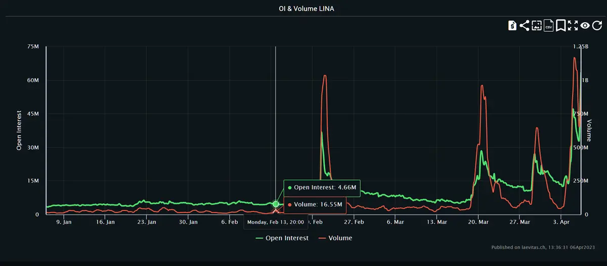 通过 Laevitas 平台查看 Lina 的成交量和未平仓合约数据,我们可以发现,在突破发生前,Lina 的日成交量为 1600 万,而未平仓合约为 450 万。