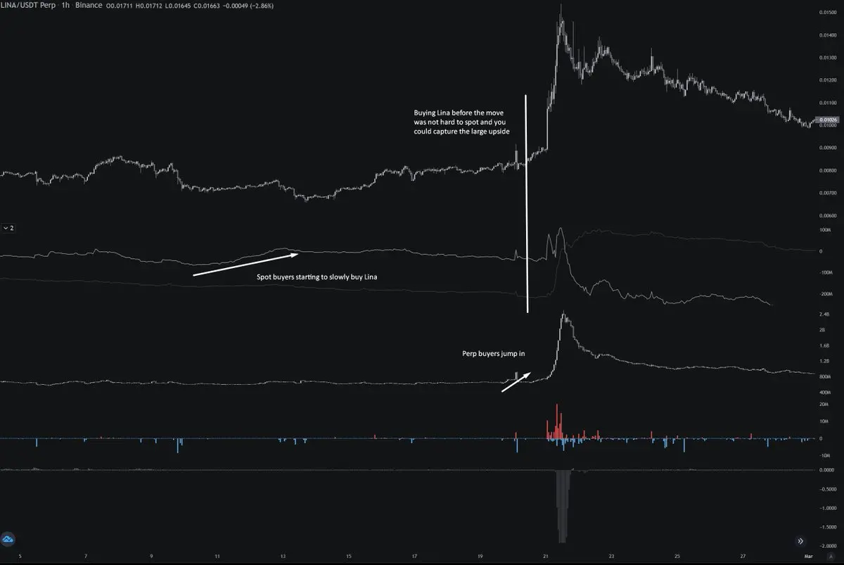 以 Velo 上的 Lina 为例,从图表中可以看到,在突破发生前几天,就已经可以观察到 Lina 的潜在突破信号。
