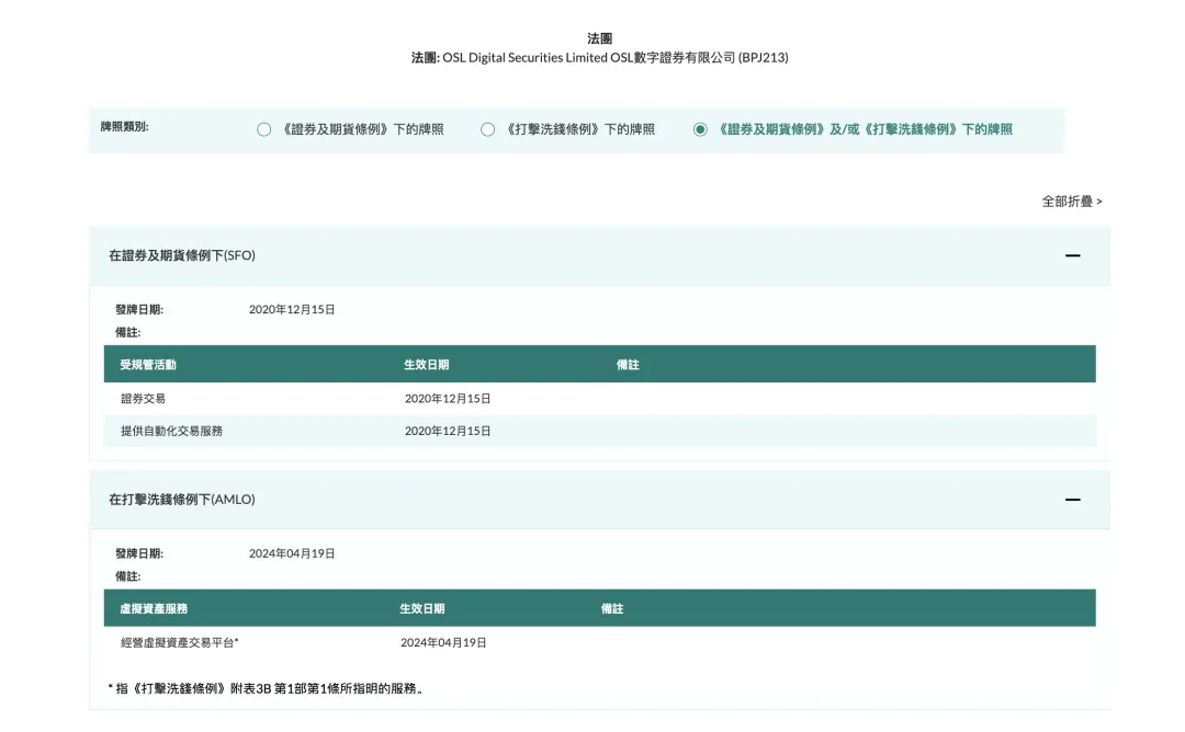 OSL Exchange,已获得 1 号和 7 号牌照,及经营虚拟资产交易平台许可
