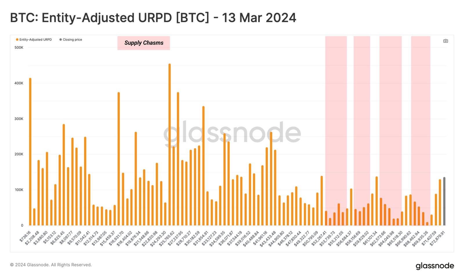 2024 年 3 月,在 ETF 推出后几个月的升值之后,几个供应集群的供应在 4 万至 7.3 万美元之间易手。在随后七个月的价格波动中,该地区成为历史上最重要的供应集群之一。