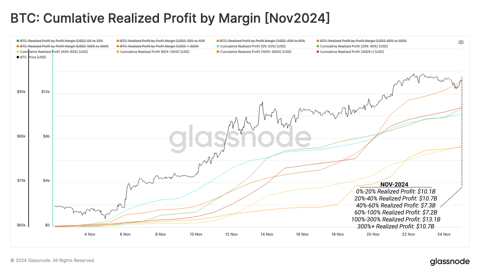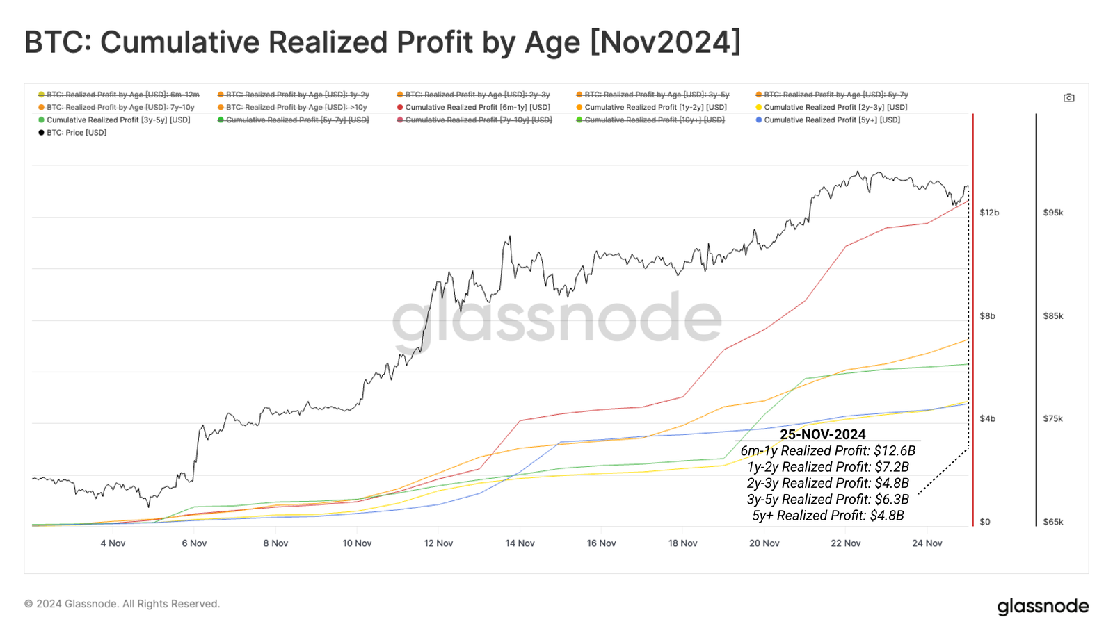 我们可以利用已实现利润指标的年龄细分来评估哪些子群体对卖方压力的贡献最大。在这里,我们按时间计算自 2024 年 11 月开始以来的累计获利了结量。